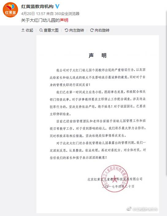 另外,今年4月,媒体消息称红黄蓝幼儿园大红门分园幼儿教师推搡、踢打孩子事件。随后,园方称涉事的两名教师和园长均已停职接受检查,并到派出所接受调查,红黄蓝教育机构也成立应急小组配合相关部门彻查,并在其官方微博上公布了相关声明。