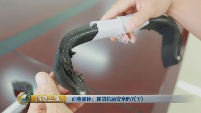 罗吉良 国家缺气保用胎标准起草人之一:胎里都已经脱层了,支撑胶都已经脱开了,从它这些来看,支撑胶是存在一些问题的,支撑胶的材料、配方,或者是成型工艺,可能存在一些缺陷,所以导致(缺气行驶)只有40分钟。