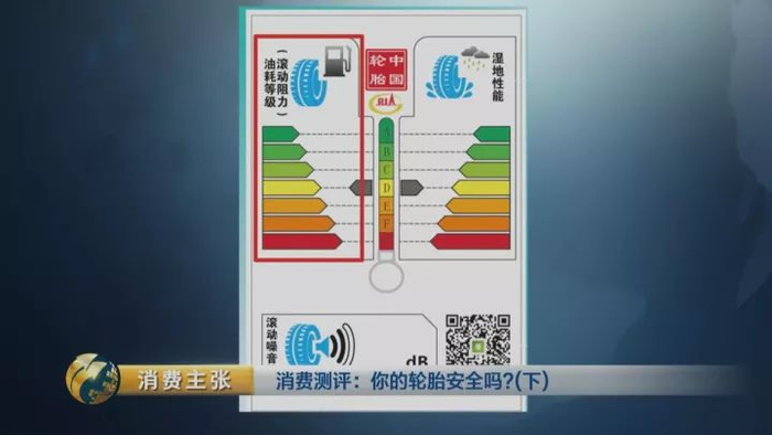 在市场里,记者发现有些轮胎上面贴有这个标签,上面写着“中国轮胎”,还标明了湿地性能、滚阻系数级别,以及滚动噪声的分贝数值。
