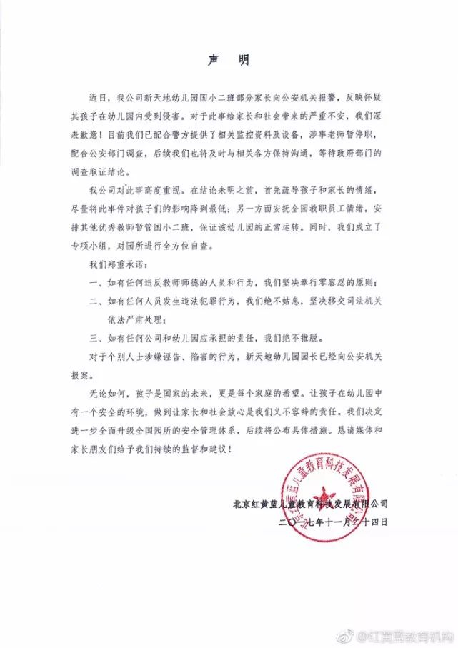 红黄蓝就“虐童”事件发声:等政府调查结论,对诬告陷害已报案!