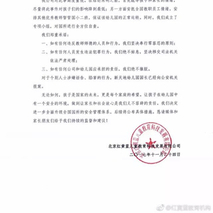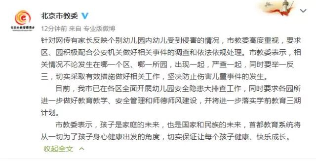 北京市教委发布微博表示,针对网传有家长反映个别幼儿园内幼儿受到侵害的情况,市教委高度重视,要求区、园积极配合公安机关做好相关事件的调查和依法依规处理。市教委表示,相关情况不论发生在哪一个区、哪一所园,出现一起,严查一起,同时要举一反三,切实采取有效措施做好相关工作,坚决防止伤害儿童事件的发生。