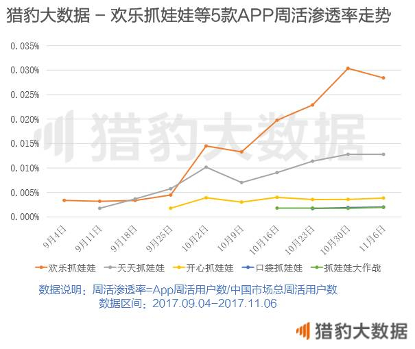 从欢乐抓娃娃等5款App周活渗透率走势图中可以看出,在线抓娃娃App渗透率整体呈现上升趋势,但尚未进入爆发期。