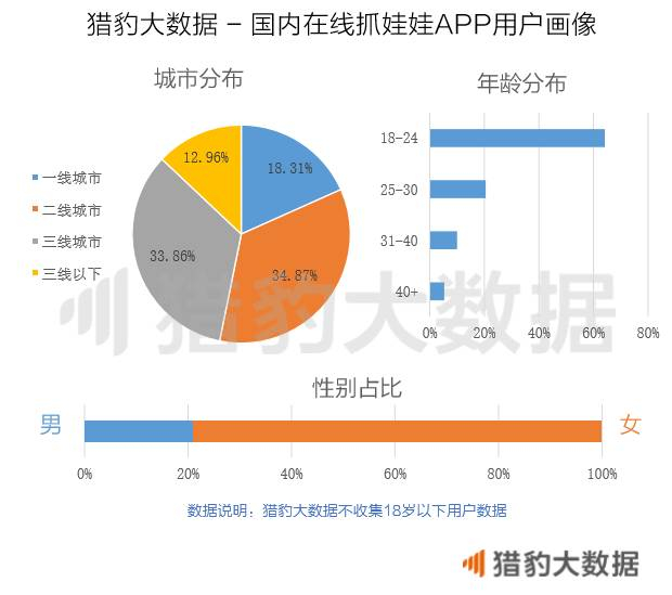 盈利则基本是依靠用户充值换取游戏币。猎豹大数据显示,抓娃娃的核心用户为二三线城市18-24岁的女性。
