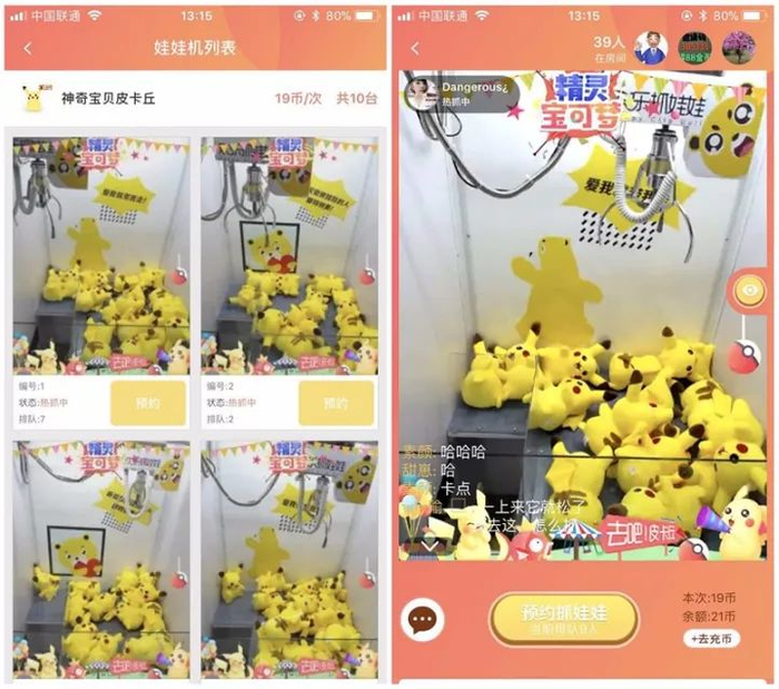 线上抓娃娃的游戏规则非常简单,用户进入App后可以选择不同的房间,每个房间同时有1人游戏及若干人围观;游戏中的用户通过手机遥控实体娃娃机,可以从正面与侧面两个视角判断爪子的位置,如果抓到了娃娃,可以选择寄送到家。