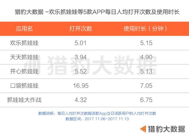 在上榜的5款App中,每日人均打开次数高于10次的仅口袋抓娃娃一款,而使用时长则全部在10分钟以下。作为一款娱乐类App来说,这两个数值确实是有点低了。