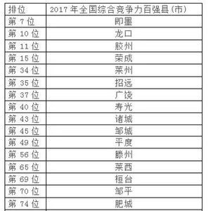 2017年全国综合竞争力百强县(市)和全国综合经济竞争力十强县(市)相继揭晓。山东分别占21席和2席位(其中即墨已设区)。