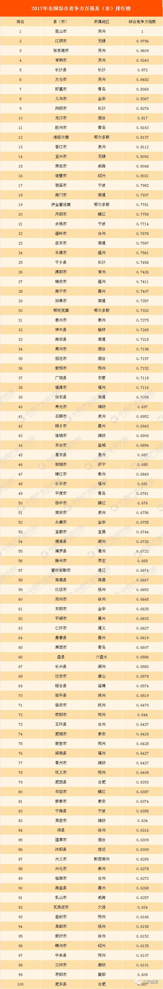 2017“全国百强县”出炉,山东21县上榜!全国第二!(附名单)