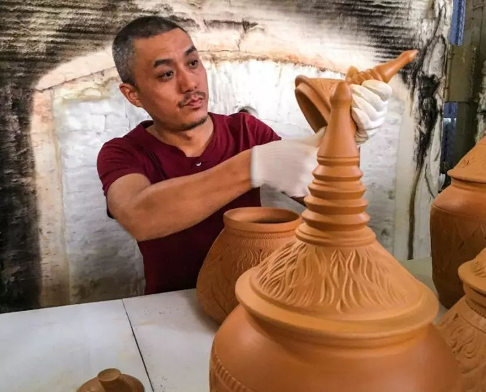 邱以胜崇尚傣族传统生活,崇尚傣族人民在漫长的历史中形成的一整套原始生态观念。在他眼里,傣族传统手工艺灿烂而辉煌,正是这些看似朴素的工艺承载了澜沧江-湄公河农耕文化的全部记忆。对传统制陶文化的保护与传承意义重大。傣陶在工艺上由手工慢轮制陶和平地堆烧工艺组成,背后却隐藏着傣族精神文化和宗教系统,傣陶具备普通日用陶器和宗教礼器的二元文化属性,原始宗教和南传上座部佛教渗透在傣陶工艺的方方面面,傣陶是名副其实的“有信仰的陶”。为了更好地传承并发扬傣陶文化,2007年邱以胜开始筹建傣陶工作室,潜心研究传统器型与纹饰,并加以整理创作,不断改进制作工艺,改善传统制陶的不足。