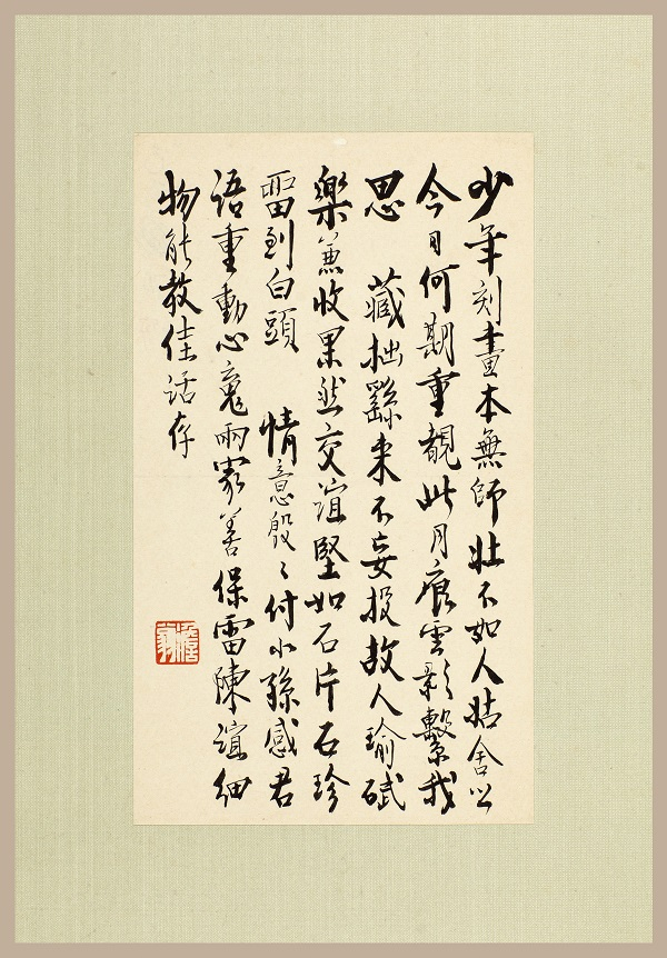 另外,陆澹安先生家教也极有特点。展厅中有陆澹安先生两件小小的手迹。一件是陆澹安先生的三首绝句,是为重逢年少时所治印章而写。诗文如下:
