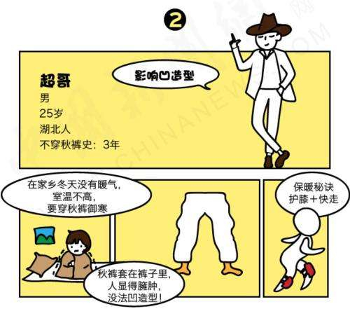 至于为什么坚持不穿秋裤,超哥说,理由很简单,一是为了形象,二是因为北方都有暖气,室内温度高,没必要穿秋裤。