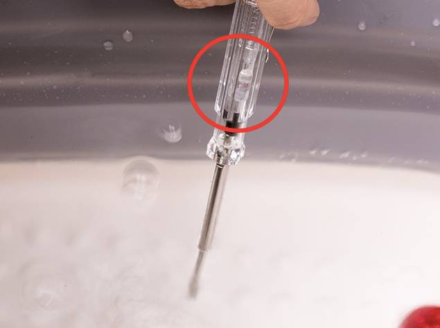 小编把电笔放在正在使用的足浴盆里,电笔的灯泡不亮(图中红圈处),说明水中完全没有电。