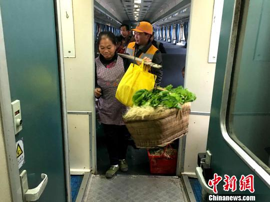 这已是这趟列车的惯例:沿途农民携带特色山货上车,列车员主动登记,为他们广播商品信息。车厢俨然成为了一个热闹的小集市,新鲜的蔬菜、山货在车上就能交易,买家和卖家都是乘客。列车员还特地配备了弹簧秤,保证买卖双方公平交易。