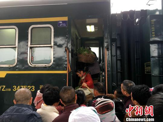 贵州农民携带山货坐绿皮车进城卖菜 车厢就是小集市