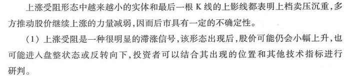 上涨受阻又称上升受阻、升势受阻,常出现在上涨途中,由三根阳线组成,其形态表现为三根阳线的实体越来越小,而且最后一根阳线带有很长的上影线。