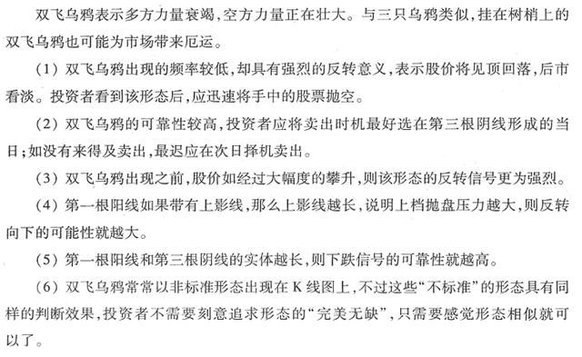 双飞乌鸦又称树上二鸦,通常出现在上升行情的末尾,由一阳两阴三根K线组成,其形成过程如下:先是收出一根大阳线,延续了之前的上升势头;第二天,股价高开低走,收出一根假阴线;第三天又收出一根阴线,且这根阴线完全将前一根阴线包住。