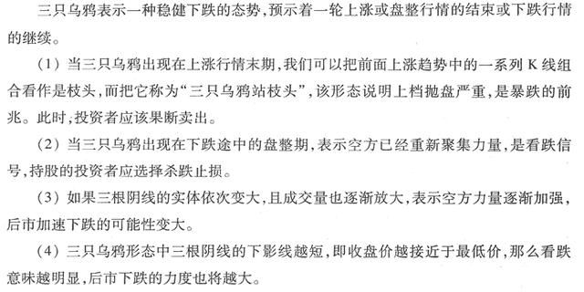 三只乌鸦又称暴跌三杰,一般出现在盘整行情或上涨末期,其特征是连续出现三根大阴线或中阴线,其中第二、第三根阴线的收盘价要低于前一天的收盘价。