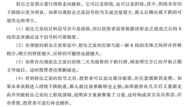 射击之星又称流星线,它与倒锤头线形态相同,只是由于所处位置不同而已。射击之星的形态特征:第一,实体很短,且位于当日整个价格区间的下端;第二,没有下影线或者下影线非常短;第三,上影线很长,其长度至少是实体长度的两倍;第四,位于一段上涨趋势的顶部。另外射击之星通常出现在上涨行情中,在当日开盘后,多方依旧保持了自己的优势,在一开始便大幅抬升股价,当股价上升到一定幅度时,空方开始发力,他们通过大量抛盘进行反攻,最终在收盘时把股价打压到了开盘价附近,射击之星表明空方在一定程度上已经进入市场,并开始显示力量,多空双方的力量正在发生变化,后市将出现下跌走势。