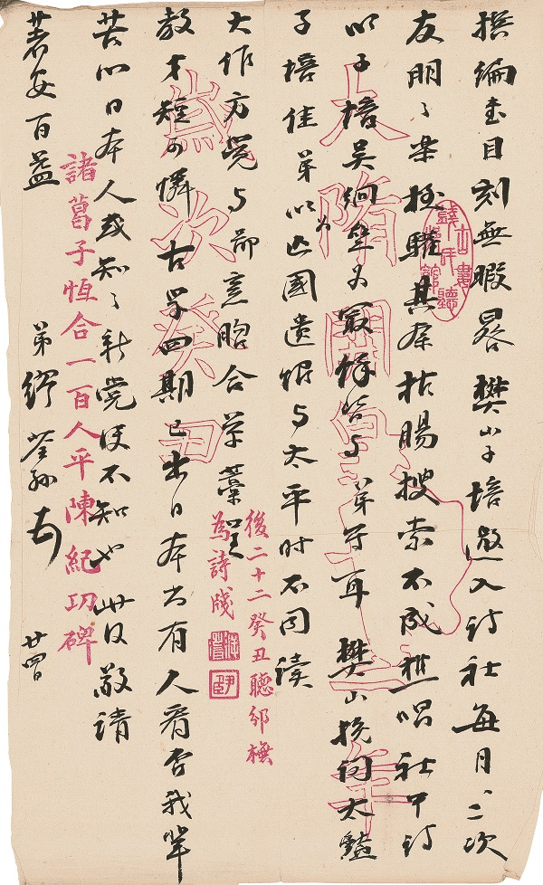 培老家事,言人人殊,能由慈护禀承母训,一力主持,可变为现款皆变之,遗著则为之辑刊,回嘉兴原屋,一切收缩,当可有办法。凡劝慈(下缺)