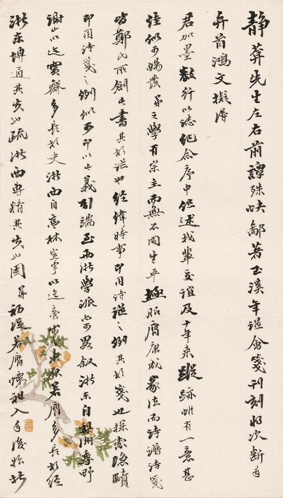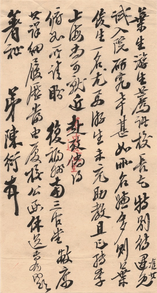 久阔不相闻,辄用笃念。比稔清华学校将开大学,并设研究院,先立国学一科,已聘执事与任公诸君为讲师。当此人不说学,即说学亦指导无人、进修无路之际,如绝壁之得天梯,汪洋之遇巨筏矣。衍十数年来一切谢绝,独蠠没各大学教授者数年,自顾生无益于人,惟稍扶书种于绝续交,犹劣能之。然千俊万杰,稀若晨星,有志者一知半解,末由深造,心私悼焉。厦门大学国文系学生百十人,可蕲成就者,廑得二人,曰叶俊生,曰游骞。游生籍贵州,郑子尹同邑人,究心周秦诸子学,治诗古文词,有《释墨》一文,寿鄙人四诗,曾刊报上。叶生福建侯官人,诗文祈向皇甫持正、孙可之,亦能为文从字顺者,有自序文二,寿鄙人文一,已有刷印。潜心考据之学,所著有《闽方言考》,已出版;《续考》《文字学名词诠释》,有油印本,尚当修补;文字学、音均学口义,《版本学考》,印未毕。以本大学三年级高材生,拔充国文系助教,儋任国文法学、文字学、形义、音均各门功课。衍老矣,喜其勤奋,然其孤寒犇走,不能常共几席,极欲其肄业研究院,受诸大师陶成。惟须乞清华校长特别待遇,准予免试入院,而特别免试,非由九鼎之言则不可得。所以求免试者,一则考试者一日之短长,李程、杜牧非关节且不得第,罗江东金榜无名,东坡尚失李方叔;二则叶生寒士,方充助教,脱考不入选,何颜返校再作都讲。往者北京国立大学将设分科,衍充教授,奏记张文襄,请经科、文科学生由各直省大吏保送举贡诸生之尤者,从之,厥后得学位者,经学、小学若陈汉章、刘复礼、黄式渔、徐道政;古文词若复礼、姚梓芳;史地若丁作霖等,特出者尤多,至今皆蔚为大师,主各地讲席,亦足征学生之不尽由考试矣。先生宏奖有素,伏望齿牙馀惠,将叶生、游生荐诸校长,乞特别待遇,准其免试入院研究,幸甚。如两名嫌多,则叶俊生一名尤要,游生未充助教,且已转学上海,尚可就近赴考。倘得俯如所请,盼复福州南三官堂敝寓。其详细履历,当由厦校公函保送。专布,即颂
