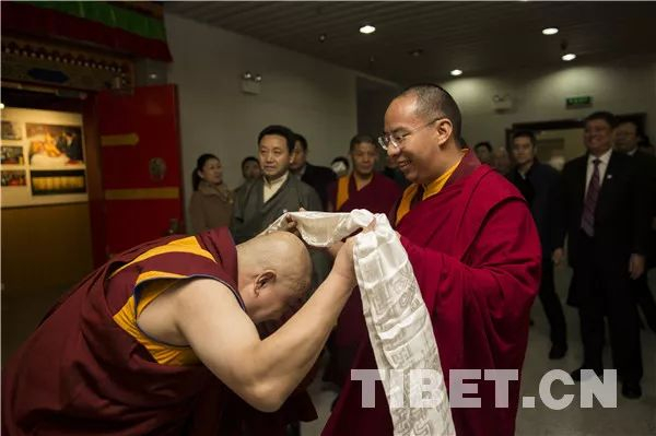 图为11月23日上午,十一世班禅来到中国藏学研究中心西藏文化博物馆参观《藏传佛教活佛转世专题展》。