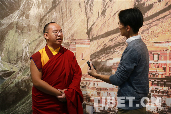 图为十一世班禅在参观完展览之后接受中国西藏网记者专访。