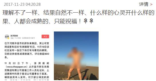11月19日下午,于某在其公司官网上传了一张自己的裸照(关键部位打马骞克),并配文:“让自己保持个性、自由、善良的状态……我知道这才是最好的自己!”