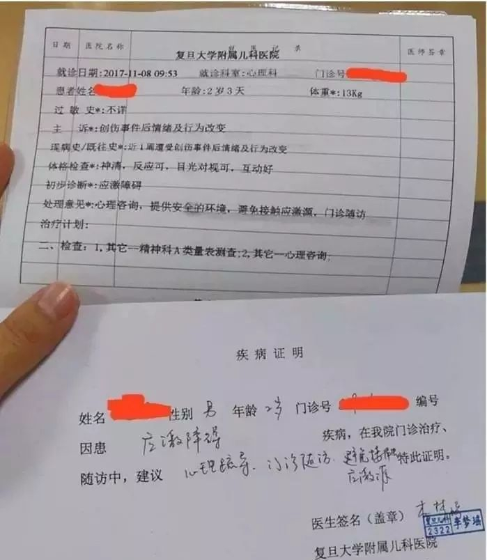 携程亲子园事件,被虐待的孩子里,有人接受了医生诊断。诊断书上,医生说得很克制:「近一周遭受创伤事件后,情绪及行为改变」,诊断为「应激障碍」。