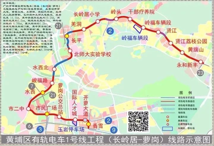 有轨电车1号线全程大约行驶35分钟,线路采用地面线,全长约14.4km,设车站19座,呈东西走向,沿开萝大道、香雪大道等大道铺设,串联了永和、长岭居、长平和新黄埔政文中心片区等重要节点,这也呼应了“广州东进、黄埔速度”的时代命题。