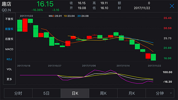 10月18日,在美国上市之初,趣店这只股票涨势惊人,但随即在10月底因为现金贷业务备受质疑,跌破发行价。11月21日晚,国家互联网金融风险专项整治工作领导小组办公室下发文件,要求各级小贷公司监管部门即日起一律不得新批设网络(互联网)小额贷款公司,趣店股价更是一泻千里,当日收盘于16.15美元,跌16.36%,较发行以来的最高价跌了一半不止,市值蒸发超过60亿美元。