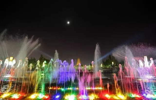 大雁塔南广场的音乐喷泉是号称亚洲第一大的北广场音乐喷泉,有许多民众在喷泉区玩耍嬉闹。南广场有玄奘雕像和大唐不夜城。西边有是咖啡酒吧饭馆的聚集地,同样热闹不已。