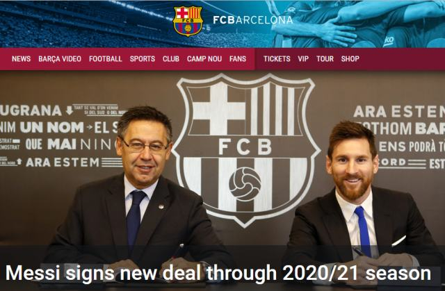 “巴塞罗那俱乐部和梅西签署了一份新合同,这位阿根廷巨星将在球队效力到2020-2021赛季……合同中设置的买断条款为7亿欧元。”巴萨在官方声明中称。