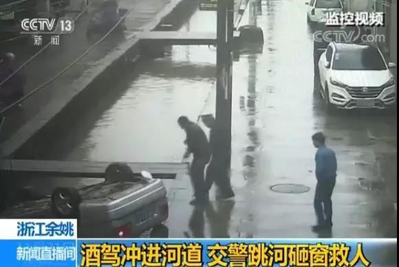 近日,浙江余姚一辆轿车失控冲进河道,交警赶到后,跳入河水,将车窗砸开救出车内的两名男子。