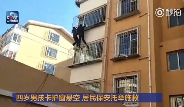 近日,山西朔州,一4岁男孩独自在家时,不慎掉到窗外,脖子卡在护窗夹缝,身体悬空。居民吴全兵和保安张胜见状沿护窗爬上四楼,进行救援。当时小男孩已呼吸困难,面色泛青。二人配合将小男孩托起,推回护窗,男孩转危为安。
