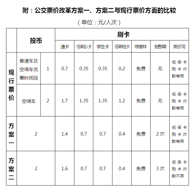 而对比票价改革前、后乘客每出行1次费用支出比较表发现,无论是方案一还是方案二,除了投币外,一卡通、学生卡、低保成人卡、低保学生卡费用都在降低,尤其是方案一,一卡通改革后均次费用为1.4元,费用可以下降0.3元。
