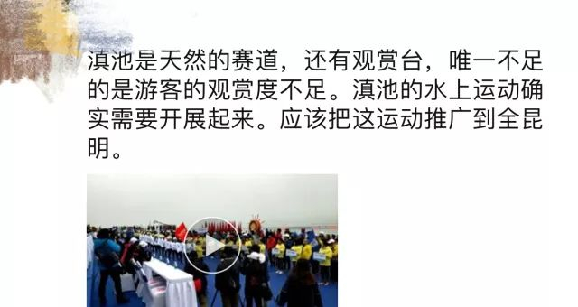“滇池是天然的赛道,还有观赏台,唯一不足的是游客的观赏度不足。滇池的水上运动确实需要开展起来。应该把这运动推广到全昆明。”