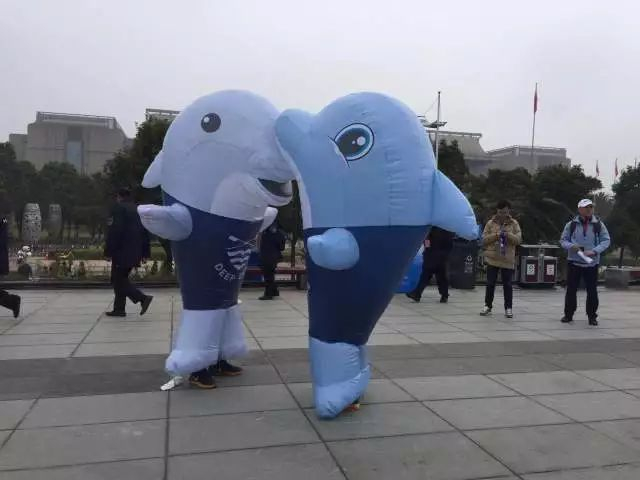 大赛吉祥物想要抱抱但是手太短抱不到,萌翻了,大家都抢着和它们合影!