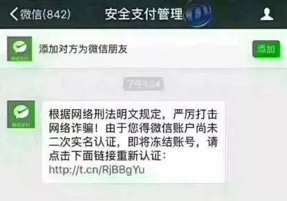 11月24日,广州市反诈中心接到群众举报,称其微信收到账号名为“安全支付管理”发送的消息,要求点击其中的网络链接进行微信二次实名认证,否则冻结其微信账号。