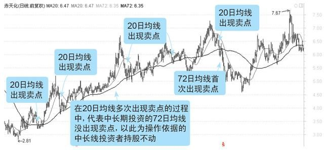 如果在上升行情的初、中期,出现这种情况可能只是一波较大幅度的回调,这就要看投资者选择什么样的周期作为买卖依据,比如,选择20日线作为买卖依据,则为中短期的波段操作,而选择72日线作为买卖依据的中长线投资者可能并不需要进行卖出,如下图所示。