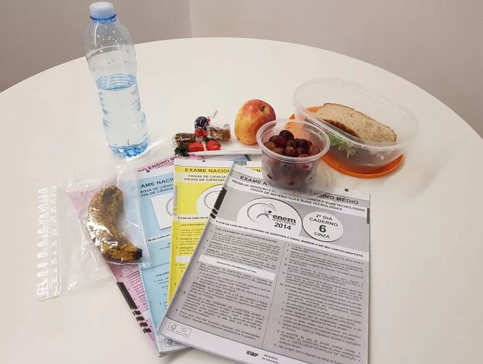 图为允许带入考场的食物,四种颜色的考卷考试内容一样,只是打乱了试题顺序。 图片来源:巴西G1新闻网