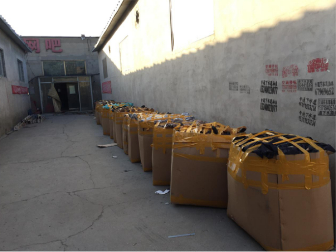11月23日下午,新建村一家网吧门口等待撤离的包裹。 摄影 本报记者 郭少丹