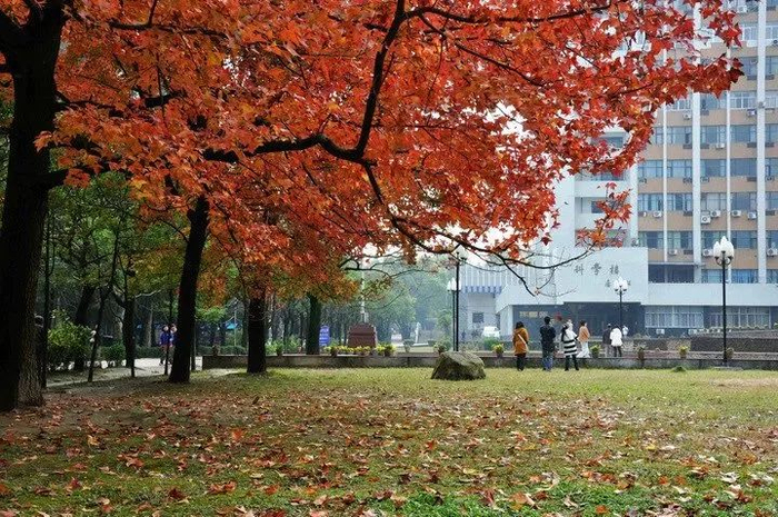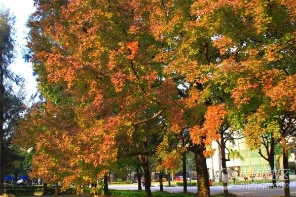 福州大学至诚学院(福州大学老校区),校园北门入口处的图书馆旁的草坪上,这里的枫叶属于三角枫品种,赏枫期一般在12月中旬到次年1月。