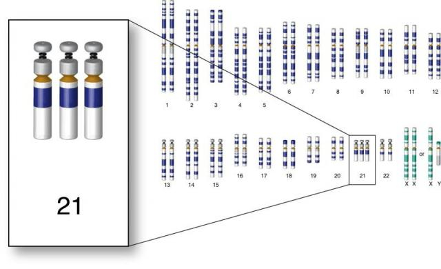 人共有23对染色体,每组都是2条,一旦某一组的数量发生突变,就会导致各种病症。比如,唐氏综合症患儿在胚胎发育早期,21号染色体就有3条,比正常人多一条。
