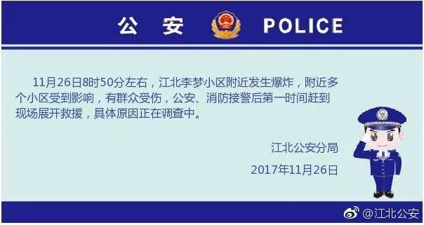 据宁波市公安局江北分局官方微博@江北公安,11月26日8时50分左右,江北李梦小区附近发生爆炸,附近多个小区受到影响,有群众受伤,公安、消防接警后第一时间赶到现场展开救援,具体原因正在调查中。