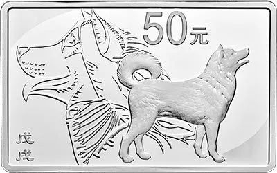 2018中国戊戌(狗)年金银纪念币中13枚本色金银币的背面图案延续了本轮生肖币(从2009中国己丑(牛)年金银纪念币开始)的设计风格,背面图案均为写实狗造型,衬以装饰狗纹样,并刊面额及“戊戌”字样。