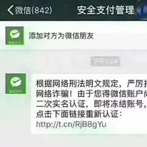11月24日,广州市反诈中心接到群众举报,称其微信收到账号名为“安全支付管理”发送的消息,要求点击其中的网络链接进行微信二次实名认证,否则冻结其微信账号。