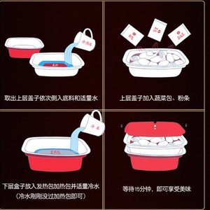 把带底料的食材放入上层,然后加热包放入下层,并加入冷水,仅几秒钟的时间,餐盒便开始散发热量。随着水蒸汽的不断涌出,10分钟左右,火锅便可以食用了。