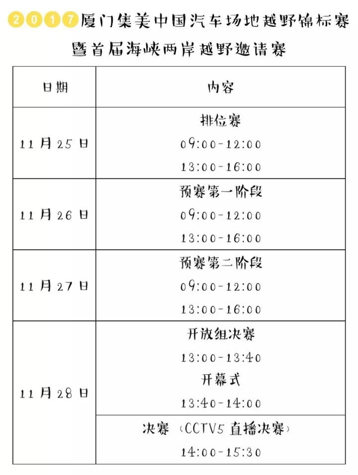 赛事由中国汽车摩托车运动联合会、厦门市体育局、集美区人民政府共同主办,厦门市集美城市发展有限公司承办。要提醒各位的是,决赛在28日下午举行,CCTV5将现场直播。