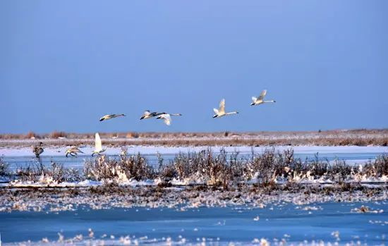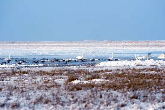冬天的艾比湖可能是新疆的湖泊中最有生气的一汪湖水了(仅限温度不是很特别的时候),岸边的枯树枝上开满了洁白的小雪花,野鸭、天鹅会在没有结冰的湖水中嬉戏,温馨而热闹的场景,没有比这个冬天更生动的画面了。