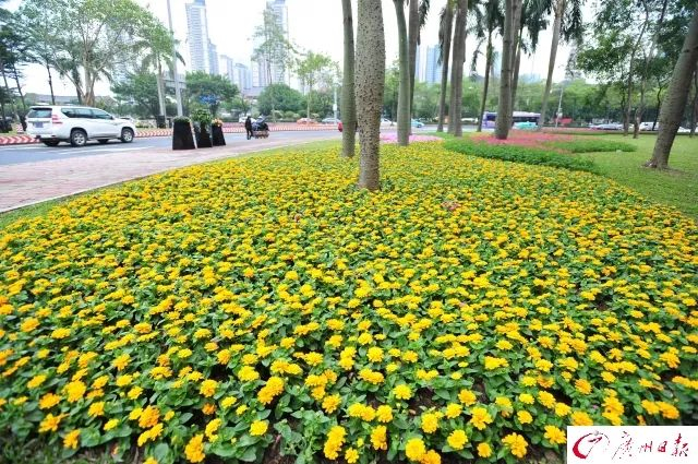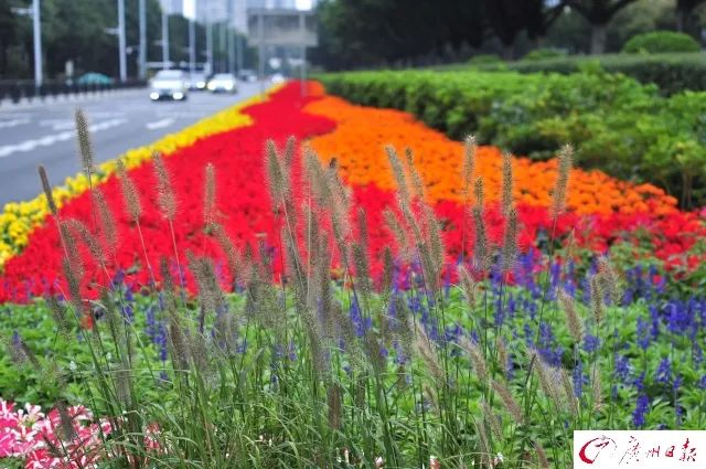 阅江路在中间分隔带布置了通透疏朗的植物,乔木以美丽异木棉等开花乔木为主,中间分隔带低层还配以时花和草地,形成了高低错落的层次景致。