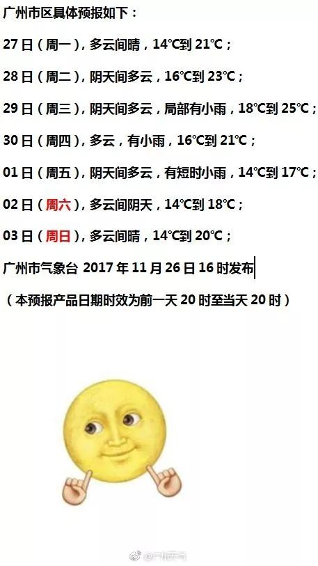 气象部门预测,未来三天,广东省大部分市县以阴天间多云天气为主,粤北偏北市县有分散小雨,各地气温逐渐回升。广州今日多云间晴,气温14℃~21℃,吹轻微的东北风;明日阴天间多云,气温16℃~23℃,吹轻微的东北风;29日,阴天间多云,局部有小雨,气温18℃~25℃。